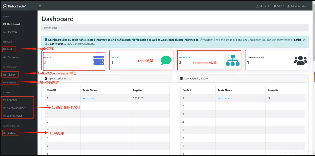 展示Kafka集群的Broker数、Topic数、Consumer数、以及Topic LogSize Top10和Topic Capacity Top10数据。