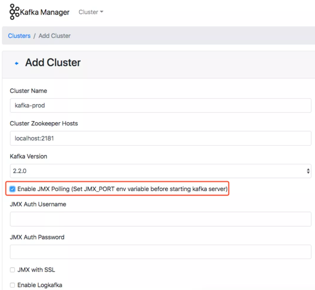 输入集群的名字(如Kafka-Cluster-1)和 Zookeeper 服务器地址(如localhost:2181),选择最接近的Kafka版本。