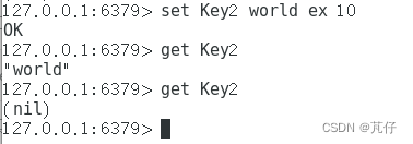 通过ex + 秒数,设置这个键值对的过期时间。可以看到图中10秒过后再去获取就为nil(表示为null)了。
