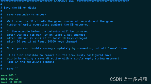 Redis允许用户通过配置文件(一般情况下在/etc/redis/redis.conf)修改save选项,定期自动执行一次BGSAVE命令。且可以同时设置多个保存条件,只要满足任意一个条件,就会执行BGSAVE。