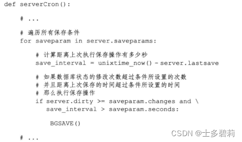 redis服务器周期性操作函数severCron默认每隔100毫秒执行一次,该函数用户对正在运行的服务器进行维护,其中一项工作就是检查save选项设置保存的条件是否满足,如果满足就执行BGSAVE命令。