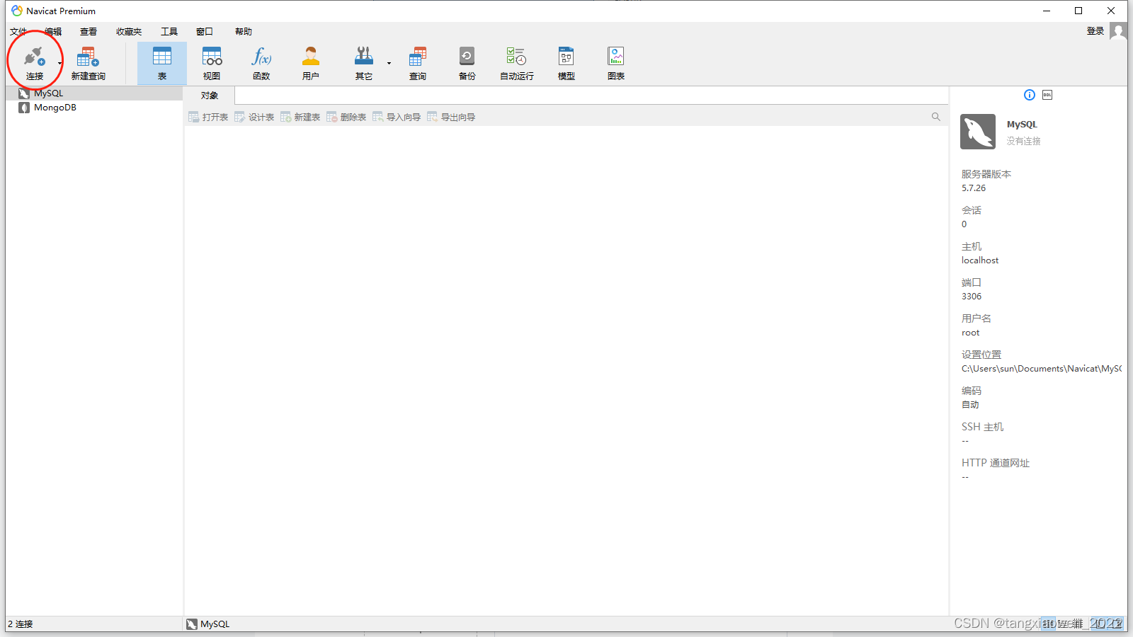 此时已经可以进行数据库的连接了,这里使用Navicat Premium 15 作为连接工具