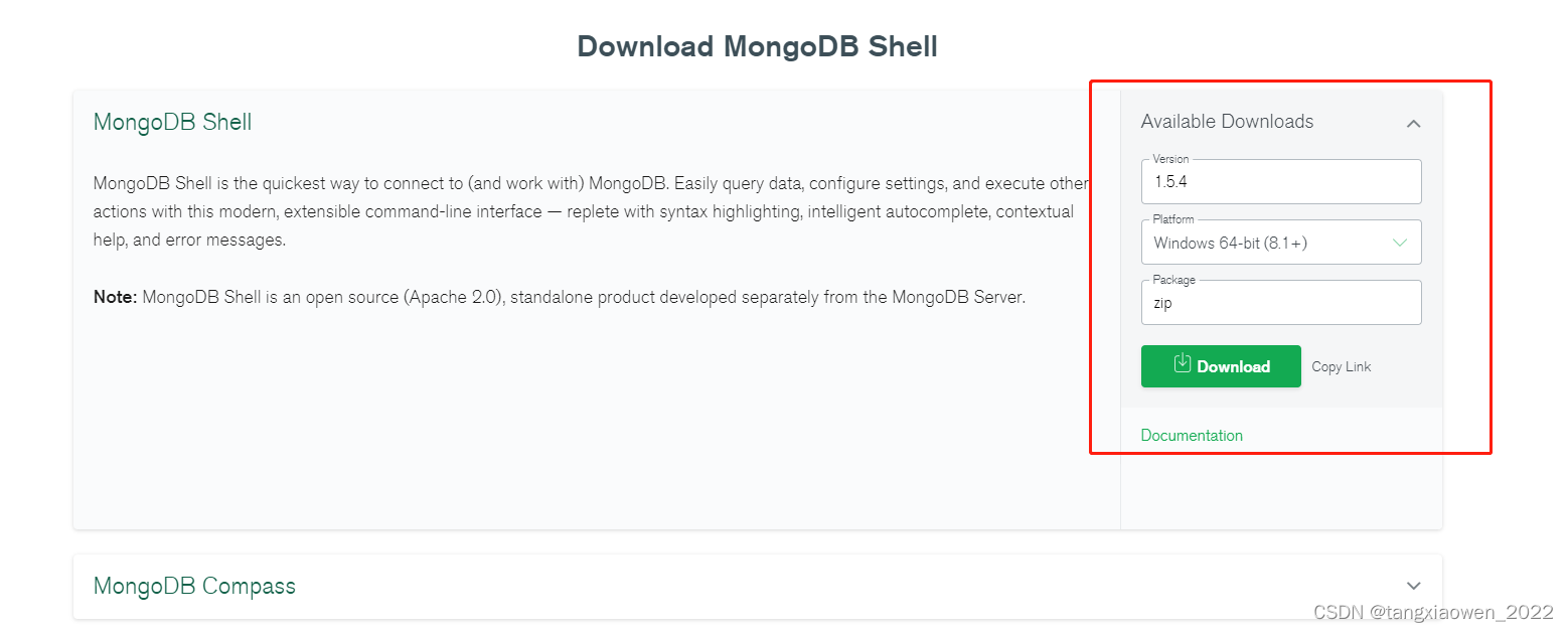 所以要想在命令行连接上数据库需要安装 MongoDB Shell,下载地址如下: