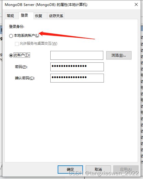 之后双击进入将登陆选项中登录身份改为本地系统账户