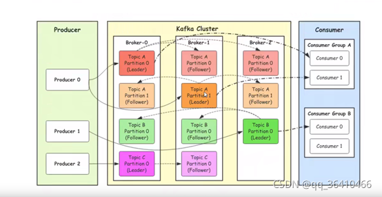 例,我们姑且认为每个broker对应一台服务器。每个kafka集群内的broker都有一个不重复的编号,如图中的broker-0、broker-1等......
