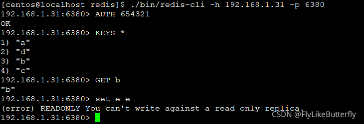 使用客户端连接到slave并查询:(由于默认设置slave是只读,所以无法写)