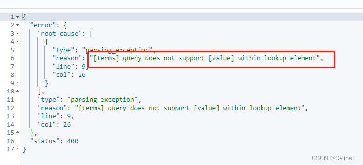 然后放在kibana执行报错:[terms] query does not support [value] within lookup element