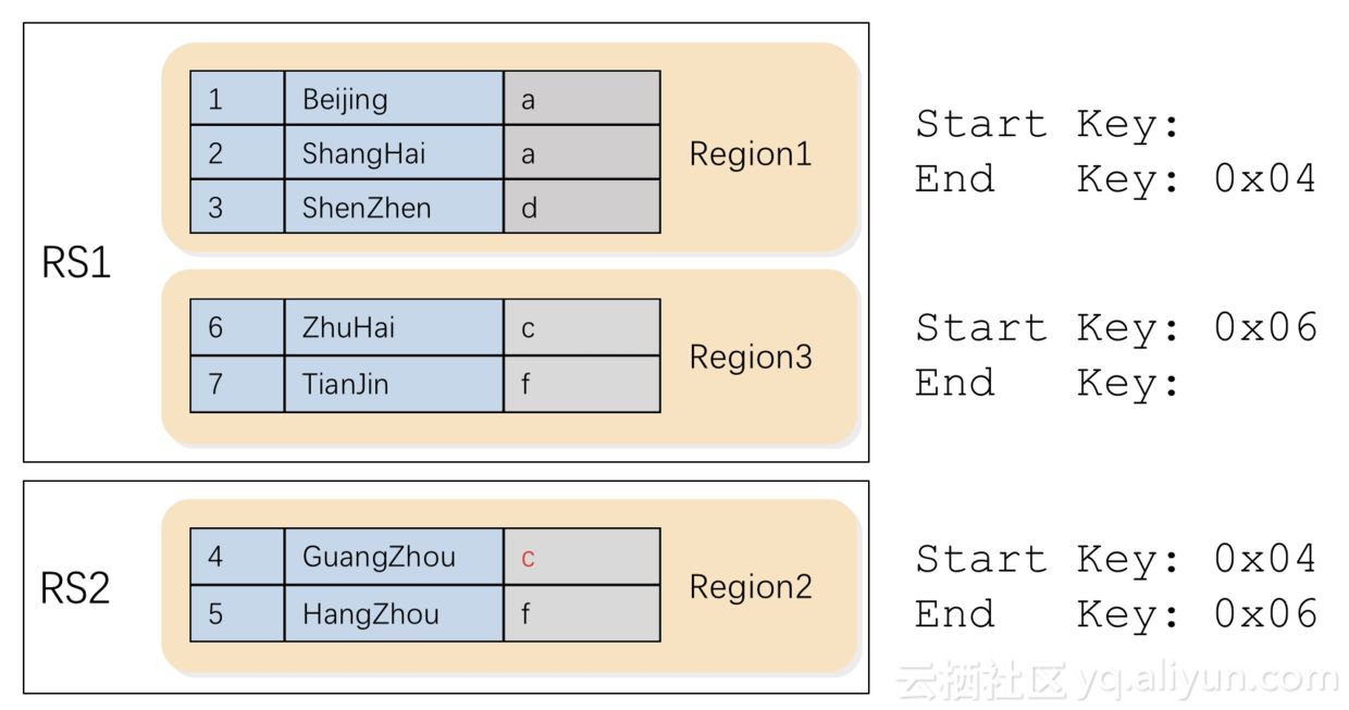 一个region负责的rowkey范围是一个左闭右开区间,所以,后一个region的start key是前一个region的end key。注意,第一个region是没有start key的,最后一个region是没有end key的。这样,这个表的所有region加在一起就能覆盖任意的rowkey值域。如下图所示: