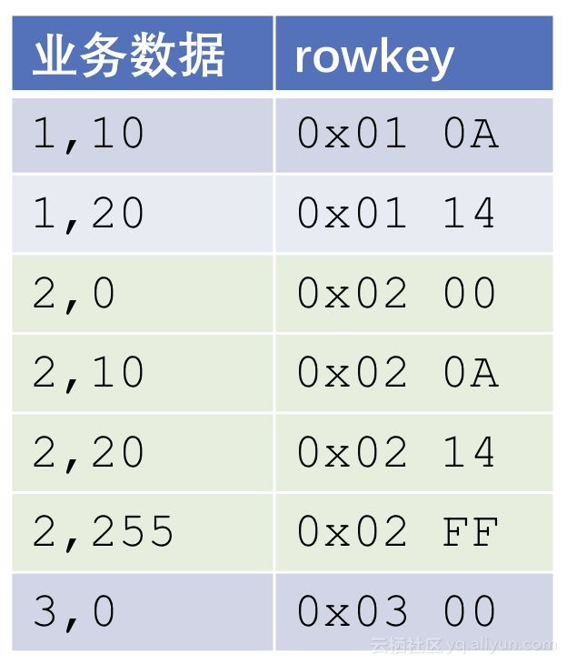 Hbase的rowkey可以理解为单一主键列。如果业务场景需要多列一起构成联合主键(也叫多列主键,组合主键,复合主键等等),就需要将多列拼接为一列。一般来说,直接将二进制拼接在一起即可。例如: