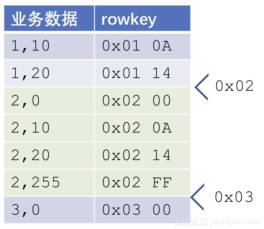 0x02比任何userid = 2的行都小。因为ts这一列是缺失的。同理,0x03比任何userid = 2的行都大,又比任何userId = 3的行都小。可见,要实现前缀扫描,只根据前缀的值就可以得到所需的startRow和stopRow,而不需要知道后面的列及其含义。
