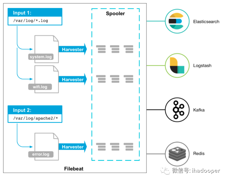 filebeat底层主要依赖libbeat库来完成日志收集,libbeat提供publisher来对接inputs, 进入到libbeat后会经过processors的一系列加工处理。 libbeat封装了retry与ack反馈持久化机制,可以保证日志收集的完整性。
