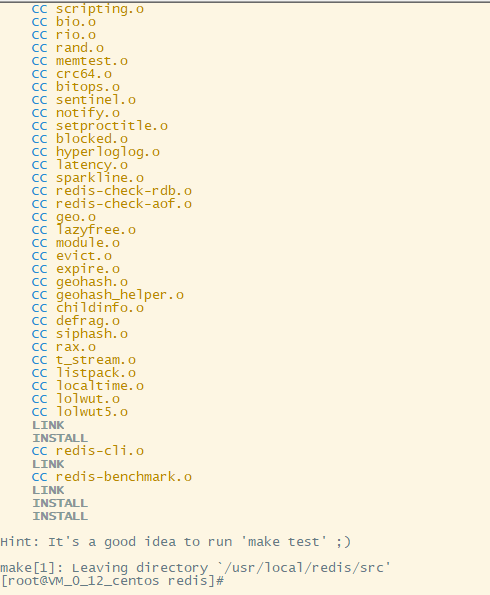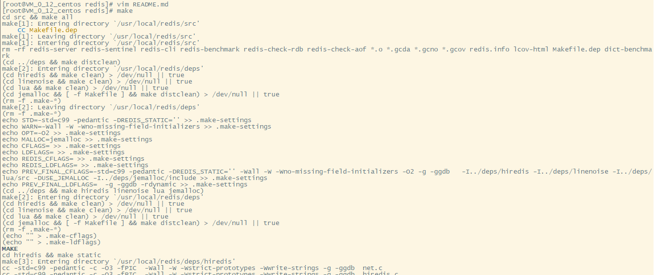 那么我们就直接用make编译(在这之前需要提前安装包gcc,如果没有安装的话在这里会报错,那么报错之后就yum -y install gcc 然后清除之前没编译完的用make distclean,这样之后继续在当前目录执行make)