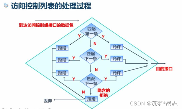 ACL工作原理:当数据包从接口经过时,由于接口启用了ACL,此时路由器会对报文进行检查,然后做出相应的处理。