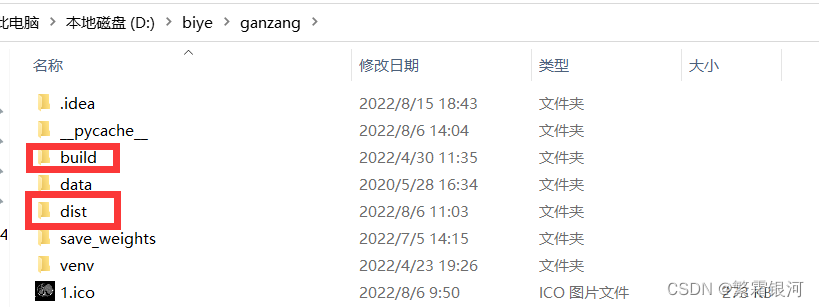 3>运行完成会多出如下几个文件,用红框标出,其中需要的exe文件在dist文件夹中