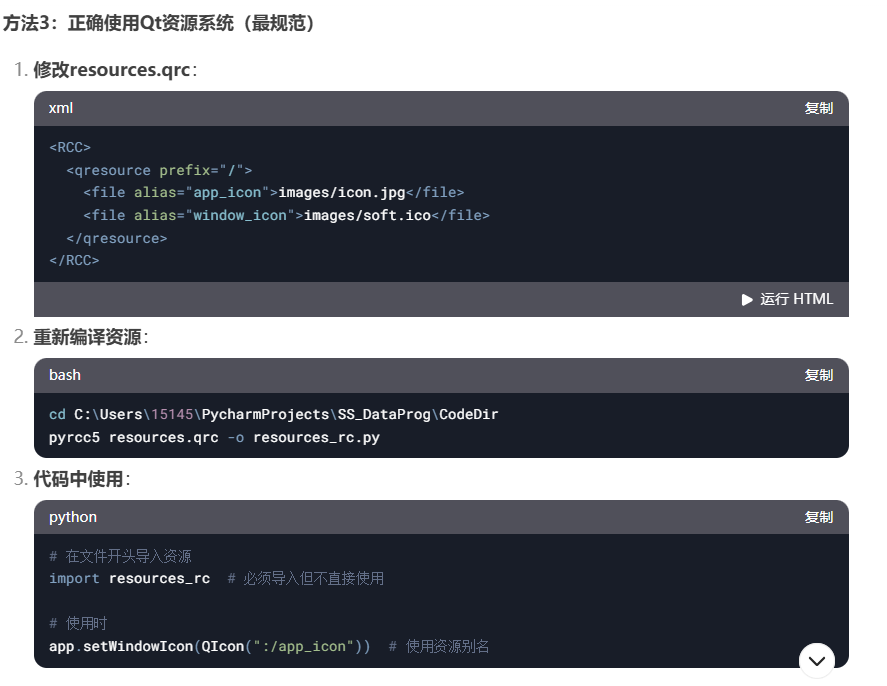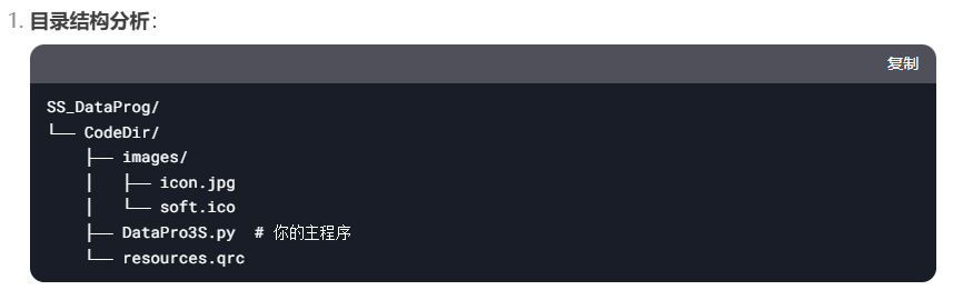 6>如果想要完整的打包整个项目(只需要发送打包好的一个.exe文件就可以在别的电脑运行),就需要使用Qt资源系统,而不是在代码中简单的读取图片,首先需要自己创建一个resources.qrc文件,编译步骤在PyCharm中的终端中执行,pyrcc5 resources.qrc -0 resources_rc.py(注意要切换到resources.qrc所在目录下)。文件结构需要设置成以下形式,以下步骤完成后同上执行pyinstall命令重新打包成.exe即可: