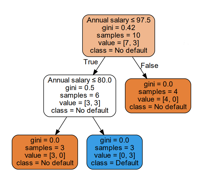 由于我们这个决策树模型最终得到的就是如果年收入在(80,97.5]区间内则会拖欠,其他情形均不拖欠(不用理会这个模型的合理性),那么对应的结果分别是: