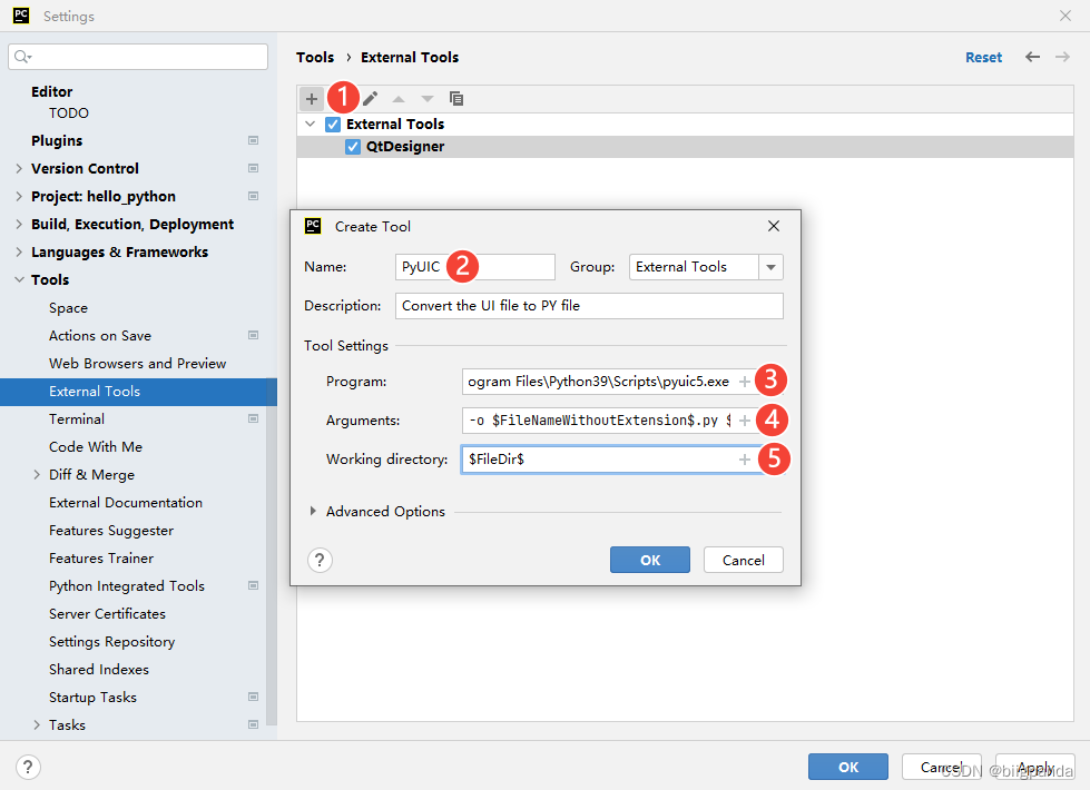 PyUIC可以将.ui文件转换为.py文件,供py文件调用,配置方法如下图: