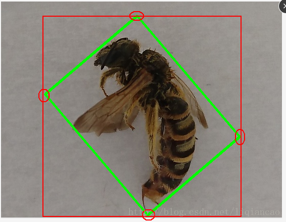 step7:裁剪。box里保存的是绿色矩形区域四个顶点的坐标。我将按下图红色矩形所示裁剪昆虫图像。找出四个顶点的x,y坐标的最大最小值。新图像的高=maxY-minY,宽=maxX-minX。