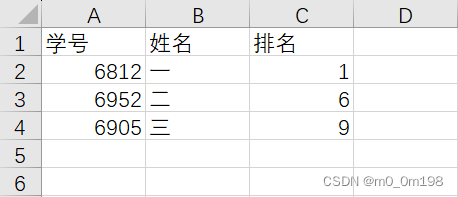 dic1 = {'学号': [6812, 6952, 6905], '姓名': ['一', '二', '三'], '排名': [1, 6, 9]}