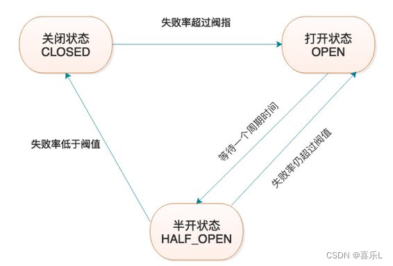 - 关闭 ----> 打开:当故障率等于或大于可配置的阈值时,CircuitBreaker 的状态将从“关闭”更改为“打开”。