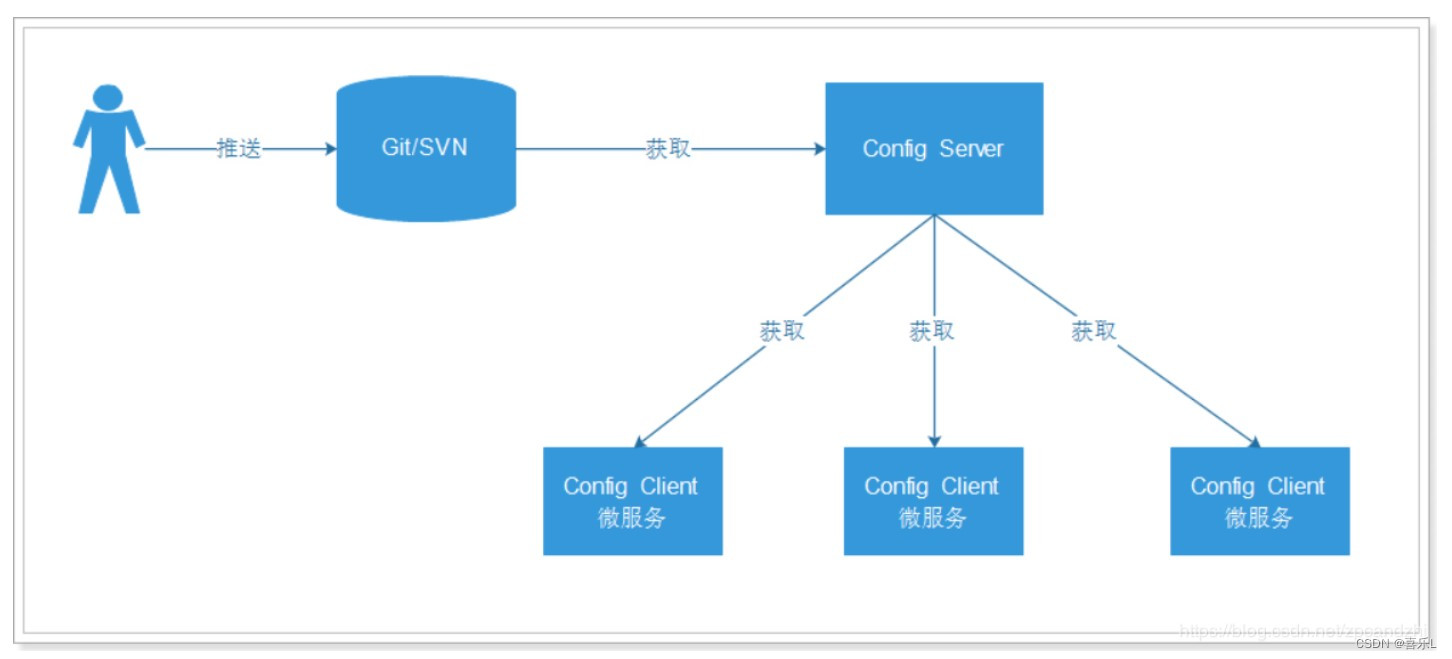 - Config Server 是一个可横向扩展、集中式的配置服务器,它用于集中管理应用程序各个环境下的配置,支持 Git、SVN、本地文件存储,默认使用 Git;