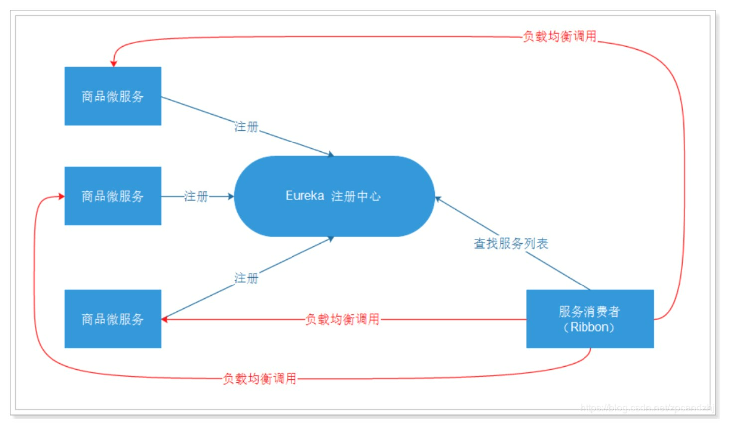 2、负载均衡组件:Netflix Ribbon,各个微服务进行分摊,提高性能;