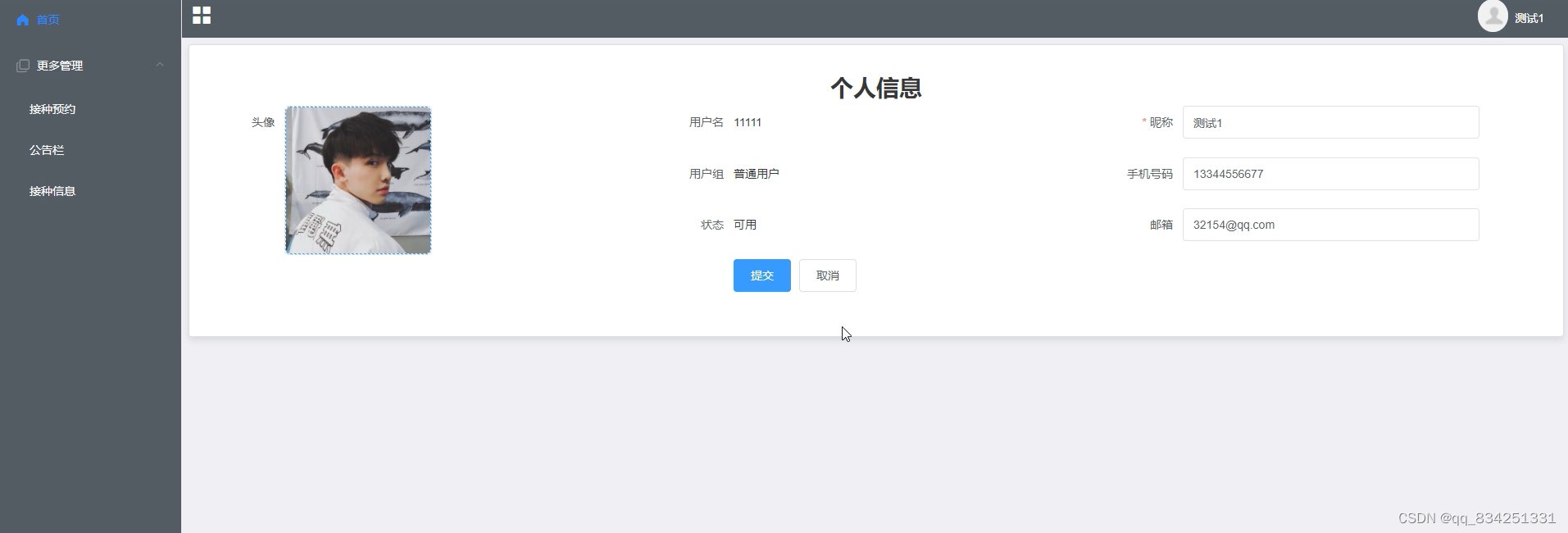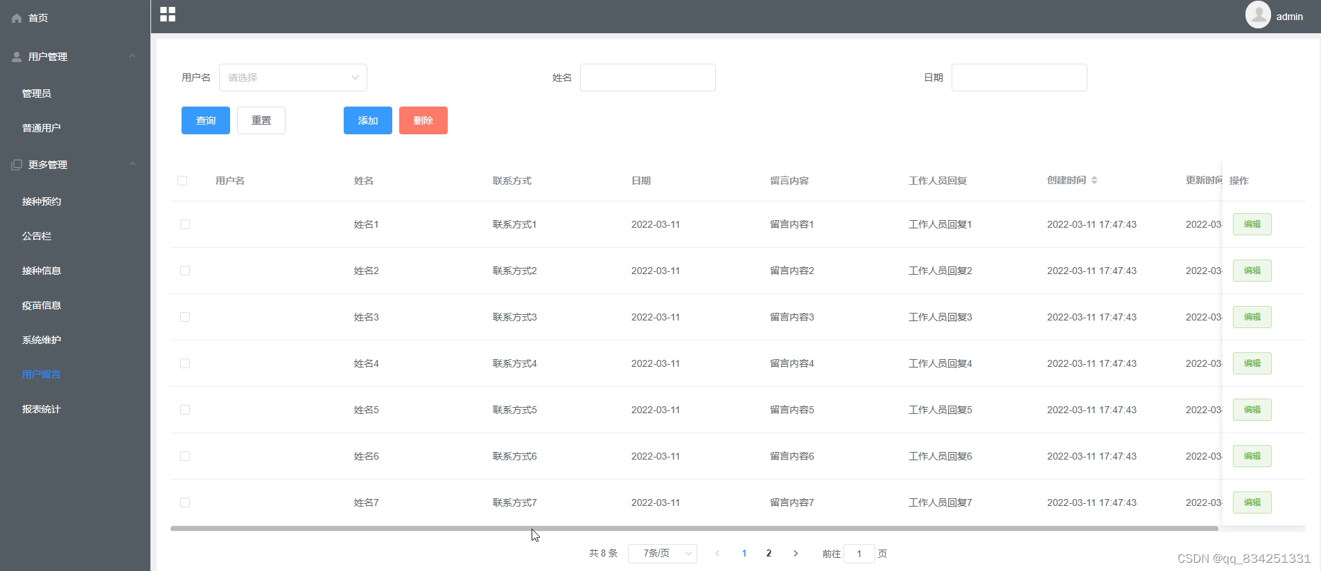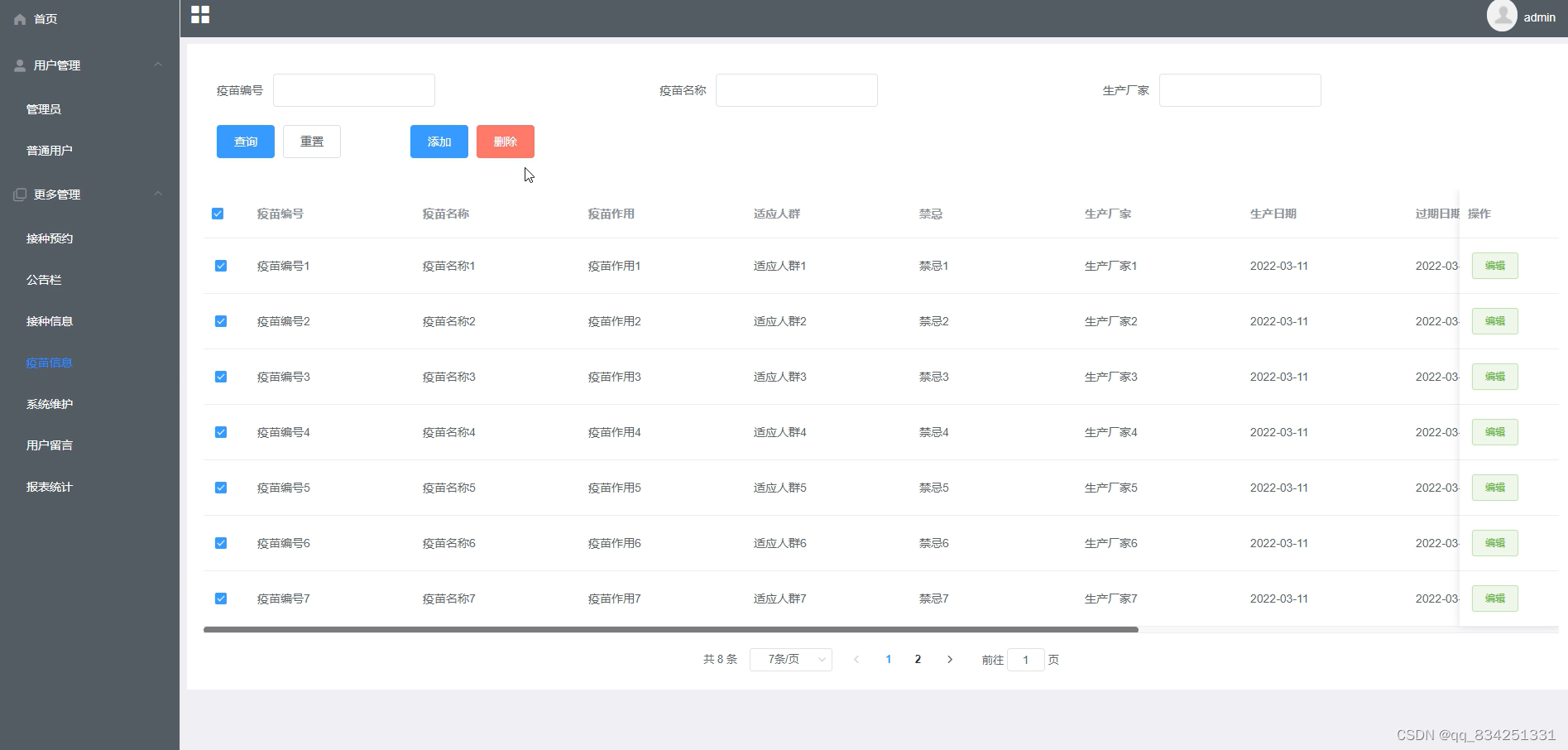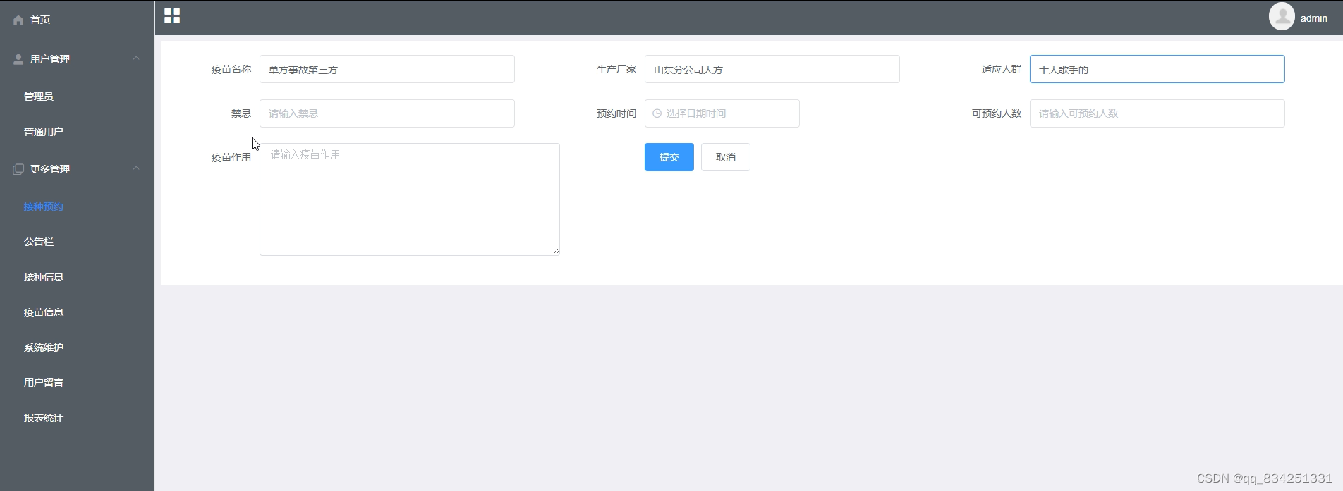 3、功能的完善性:可以管理首页、个人中心、用户管理、接种预约、公告栏、接种信息、疫苗信息、系统维护、用户留言、报表统计管理、系统管理模块的修改和维护操作。