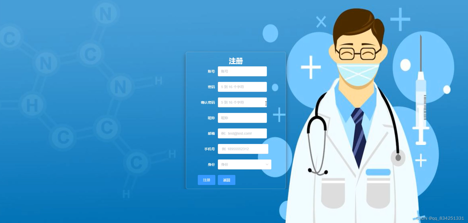 在用户注册页面通过填写用户账号、密码、用户姓名、年龄、联系电话、电子邮箱、身份证号、等信息完成用户注册