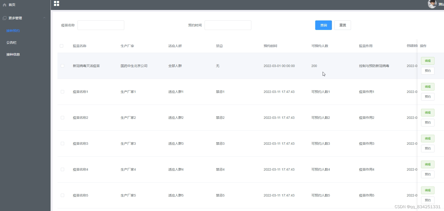 在接种预约页面可以查看索引、疫苗名称、生产厂家、适应人群、禁忌、预约时间、可预约人数等信息,并可根据需要进行修改或删除等操作