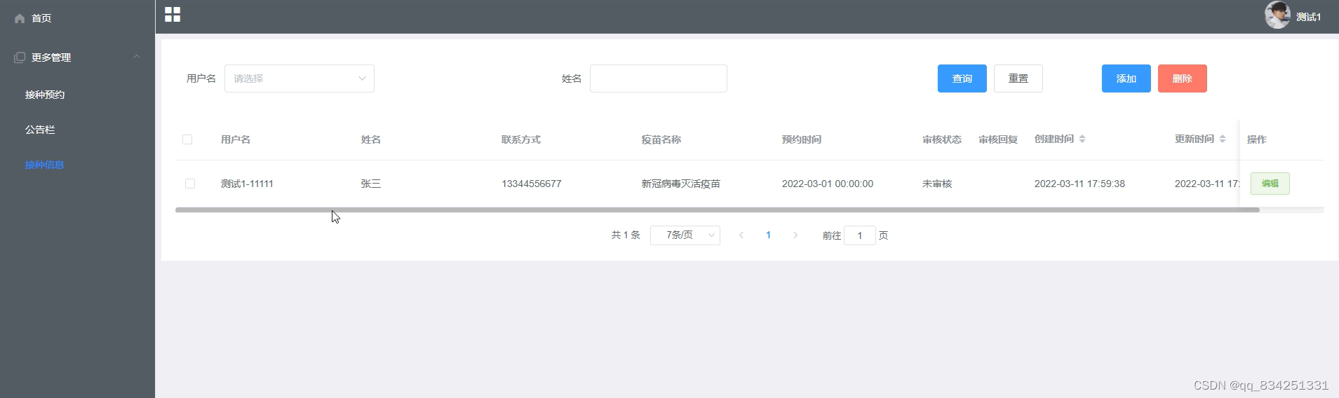在接种信息页面可以查看索引、用户名、姓名、联系方式、疫苗名称、预约时间、等信息,并可根据需要进行修改或删除等操作
