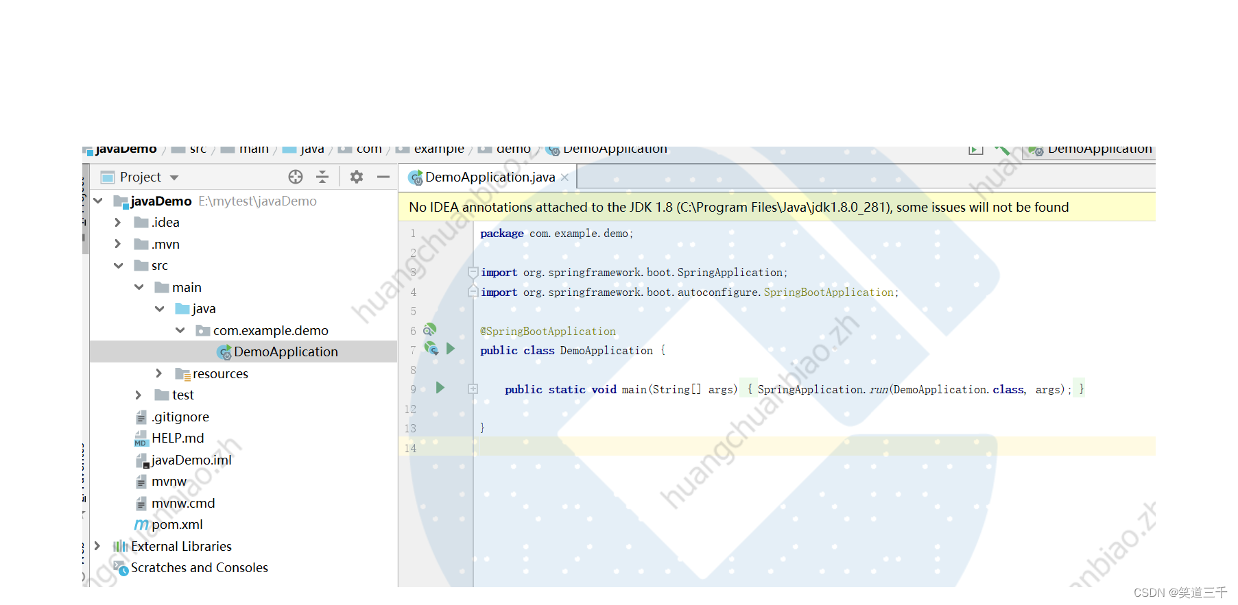 6. 返回 IDEA 工作区,可以看到 Spring Boot 项目 demo已经创建完成。该项目不但具有完整的目录结构,还有完整的 Maven 配置,并默认生成了一个名为 demoApplication 的主启动程序。