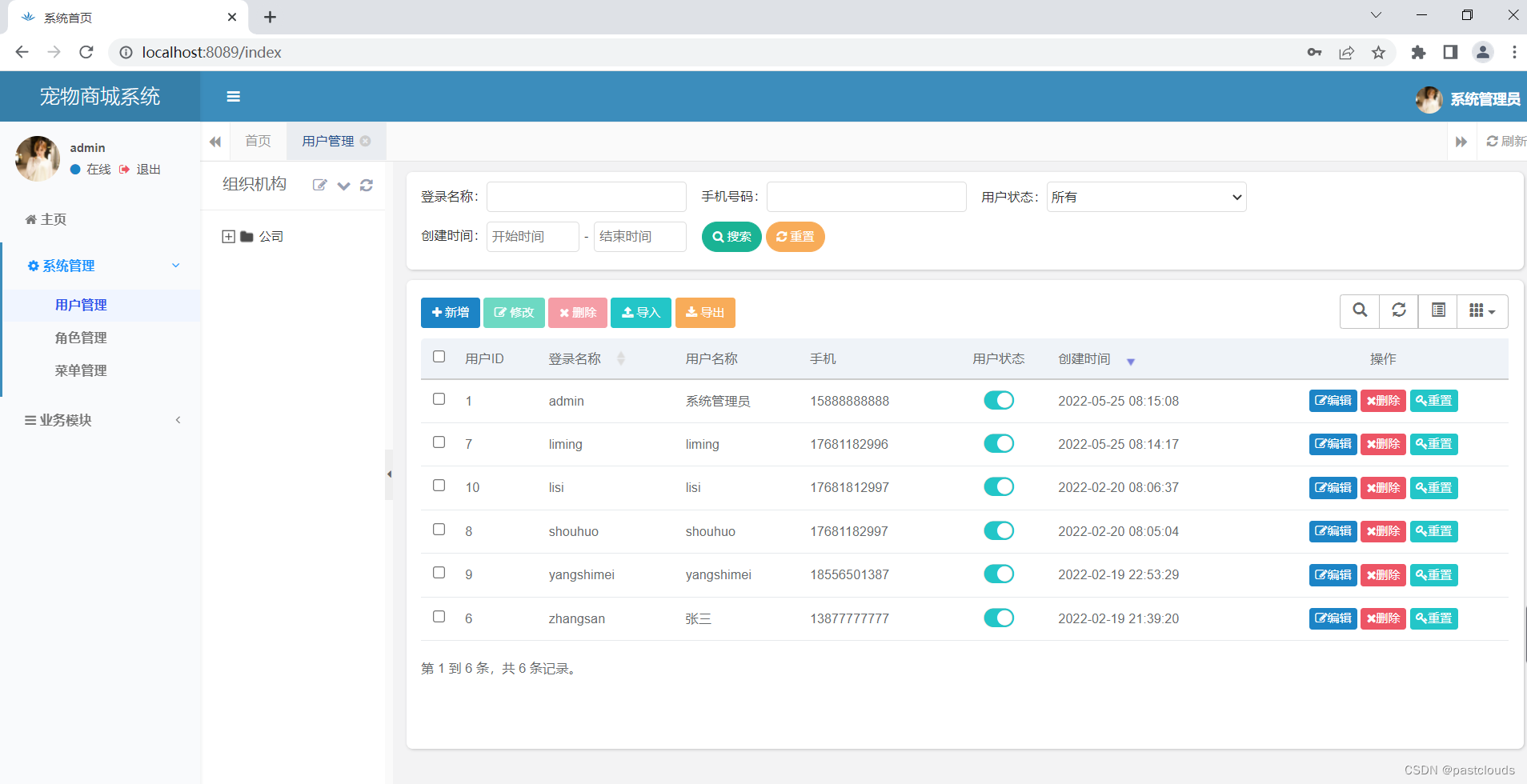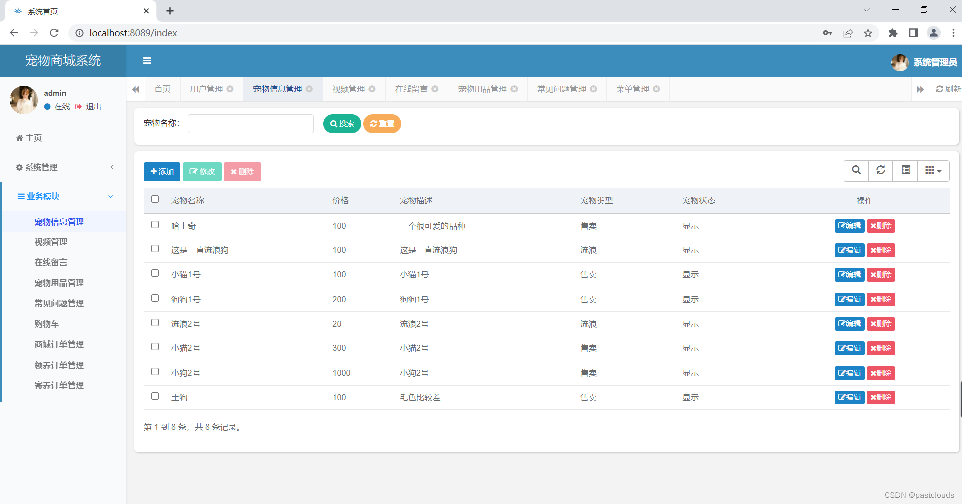 用户管理、角色管理、菜单管理、宠物信息、视频管理、在线留言、宠物用品管理、