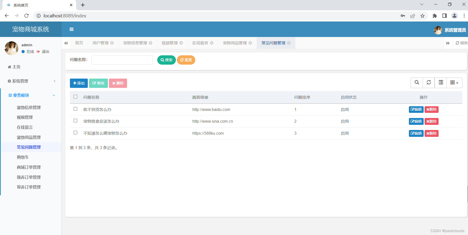 常见问题管理、购物车、商城订单、领养订单、寄养订单