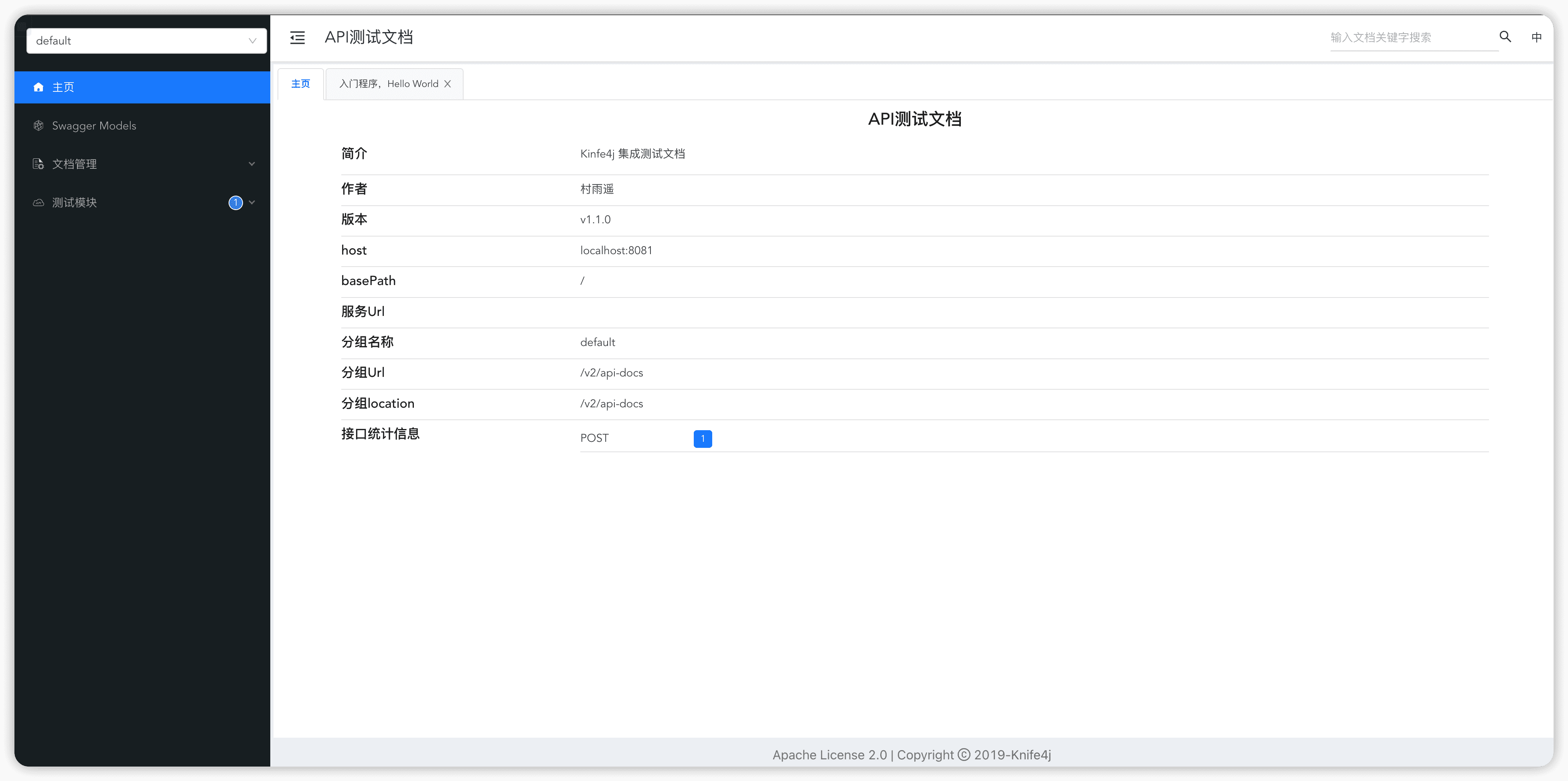 ,就会出现以下的主界面。这里有我们之前在配置类中所设置的一些接口信息,此外,还对接口进行了统计。因为我们代码中只写了一个 POST