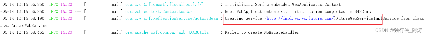 2022-05-14 12:15:58.190 INFO 15520 --- [ main] o.a.c.w.s.f.ReflectionServiceFactoryBean : Creating Service {http://impl.ws.ws.future.com/}FutureWebServiceImplService from class com.future.ws.ws.FutureWebService