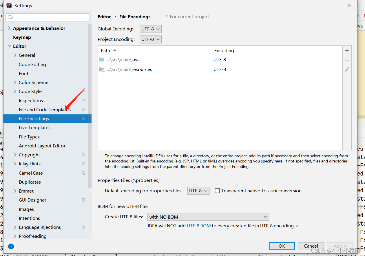 settings->File Encoding 将项目相关的编码格式都设置为“UTF-8”注:修改后需要重新编辑配置文件或者删除后,再次创建