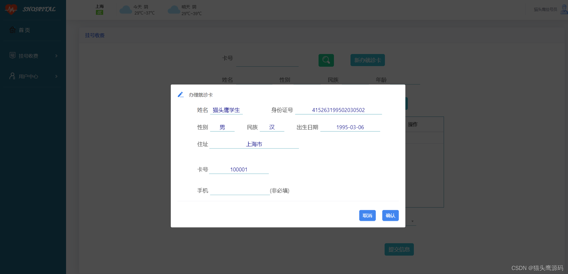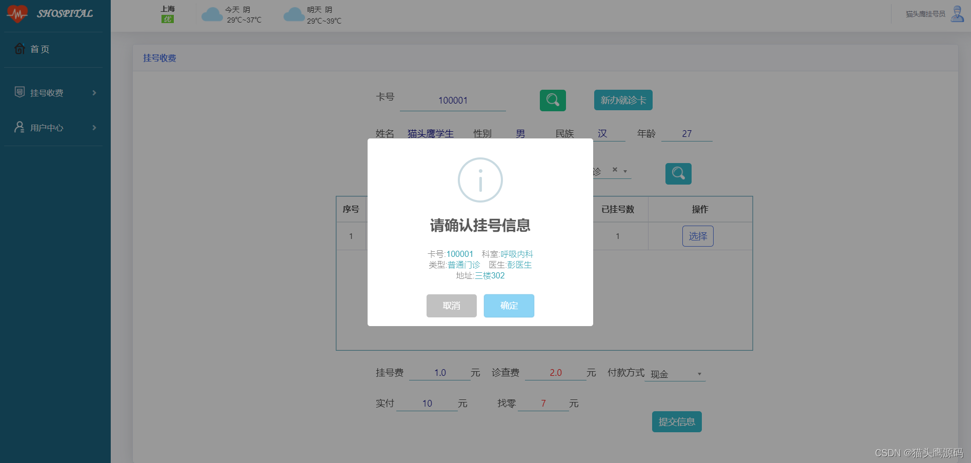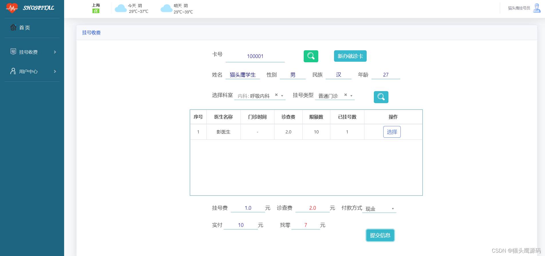 挂号模块:患者通过读取卡号获得个人信息并进行挂号。点击提交信息后到门诊医生处诊疗。