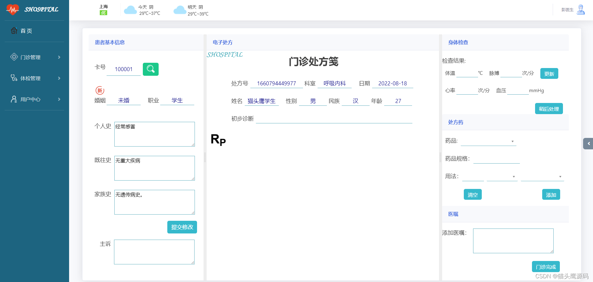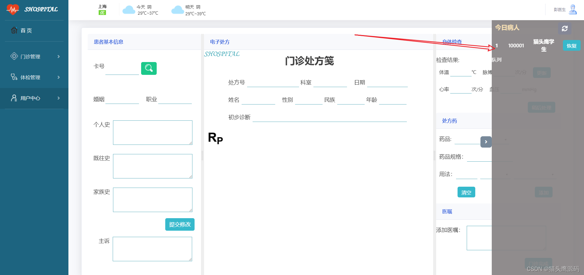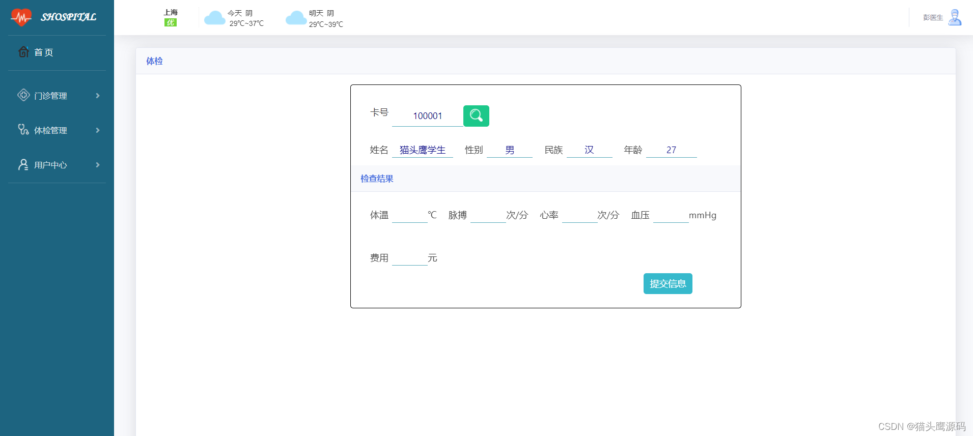 体检模块:患者到体检医生处填写就诊卡号后进行常规检查并提交信息。