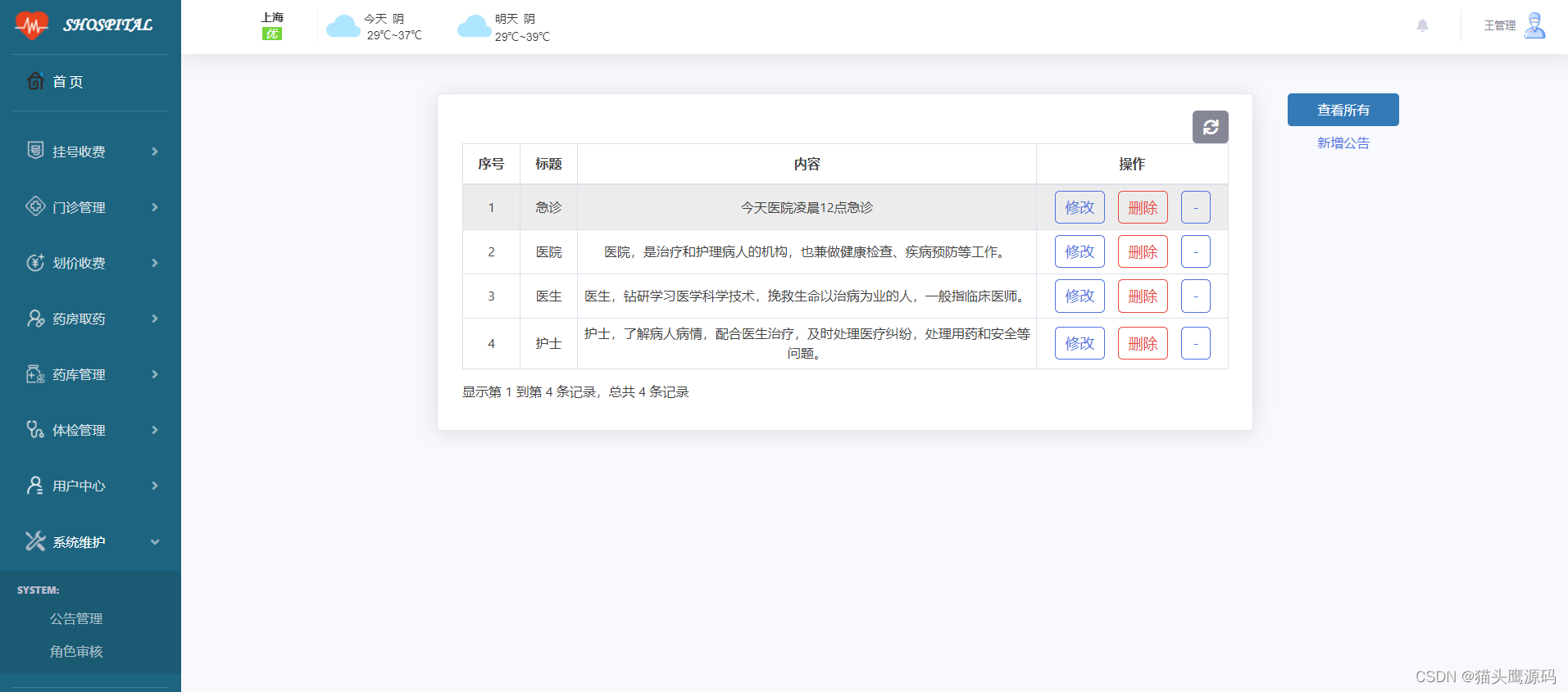 该系统为采用springboot技术,主要围绕患者挂号、就诊,体检,医生门诊,药房、药库管理等功能的实现,医院管理系统不仅仅只是针对医院功能的管理,更是将患者的详细信息、医院的门诊信息、医生的诊断信息、药库的药品信息等等都列为此次系统将要实现的功能,具有完整的业务逻辑。适合用于毕业设计、课程设计、数据库大作业等学习使用。...