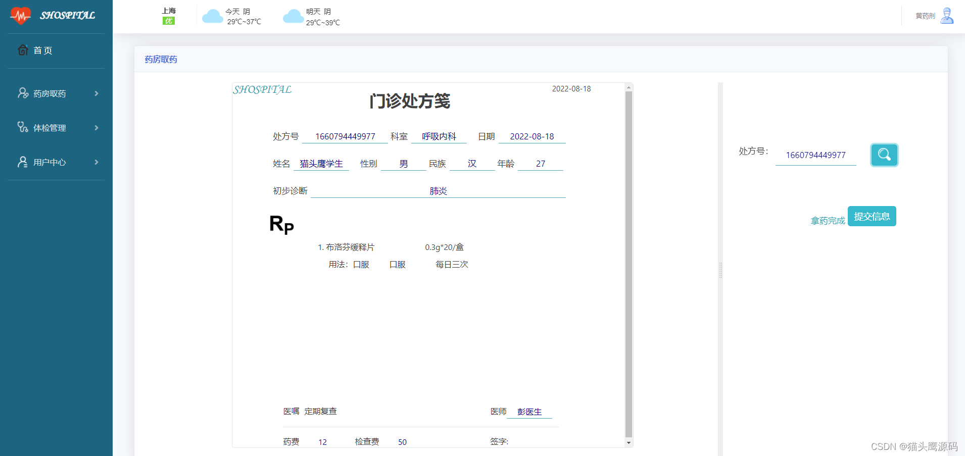 取药模块:患者在缴费完成后凭借处方号到药房取药,完成医院就诊。