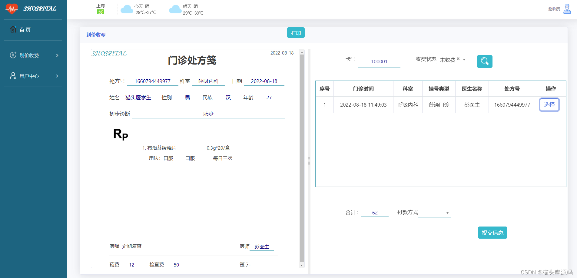 缴费模块:门诊完成后患者凭打印的电子处方到缴费处结账,结算后到药房处取药。