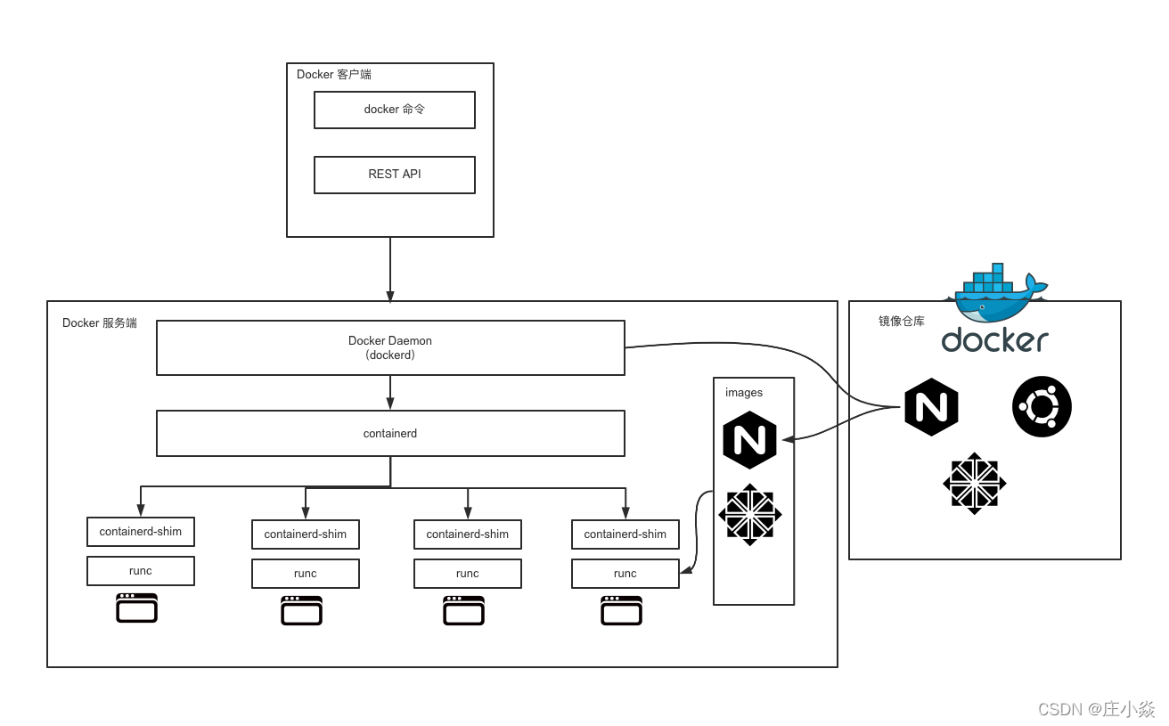 Docker 是一个客户端-服务器(C/S)架构程序。Docker 客户端只需要向 Docker 服务器或者守护进程发出请求,服务器或者守护进程将完成所有工作并返回结果。Docker 提供了一个命令行工具 Docker 以及一整套 RESTful API。你可以在同一台宿主机上运行 Docker 守护进程和客户端,也可以从本地的 Docker 客户端连接到运行在另一台宿主机上的远程 Docker 守护进程。