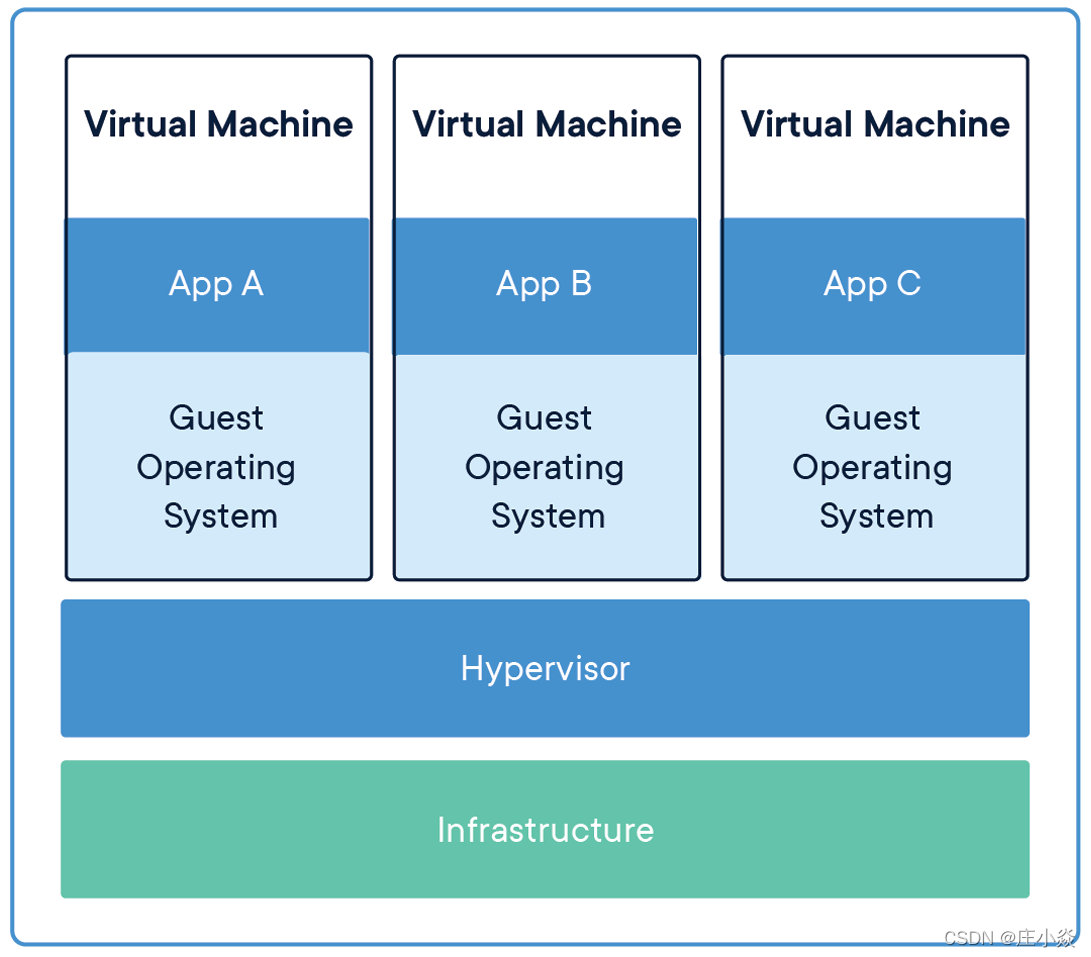 - 虚拟机的缺点在于 Guest OS 通常会占用不少硬件资源。例如 Windows 安装 VMware 并开机 Guest OS,不运行任何应用的情况下,就需要占用 2 ~ 3G 内存,20 ~ 30G 硬盘空间。而且为了应用系统运行的性能,往往还要给每台虚拟机留出更多的内存容量。虽然不少 Hypervisor 支持动态内存,但基本上都会降低虚拟机的性能。在这样的资源占用情况下,少量的虚拟机还是可以接受的,如果同时运行十多台或数十台虚拟机,硬件资源的浪费就会成倍递增。通常来说,其中相当大一部分甚至全部 Guest OS 都是相同的。
