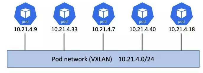 每个 Pod 都会附着在同一个大的扁平的 IP 网络之中,被称为 Pod 网络(通常是 VXLAN 叠加网络)。