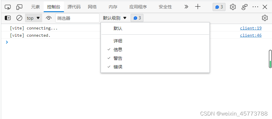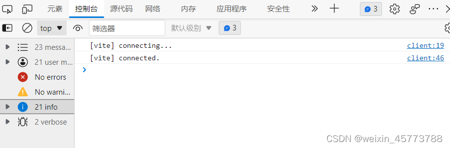 解决方案:左侧top栏选择info,默认级别(Default levels)中信息选项(info选项)要勾选,筛选器中清空。