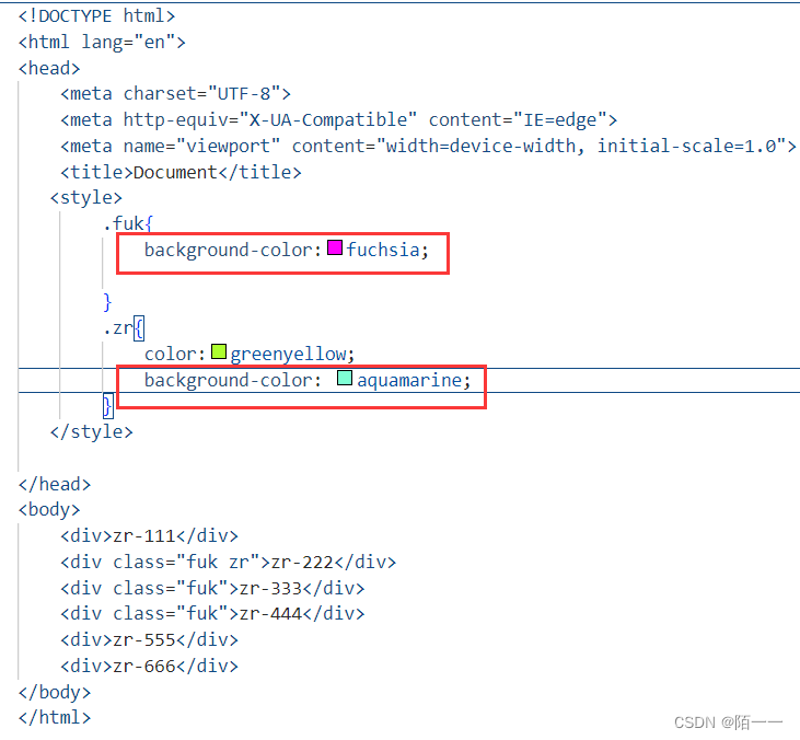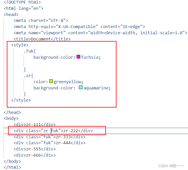 通过结果我们发现了,运用的是zr最后一个设置的样式,这个时候就有人说了:那肯定是就近原则喽,看下面的class=“fuk zr”先等于的是“fuk”后等于的是“zr”所以就近原则最后用的是zr的,那如果我们将fuk和zr调换一下位置呢,又是什么样的情况,看下图: