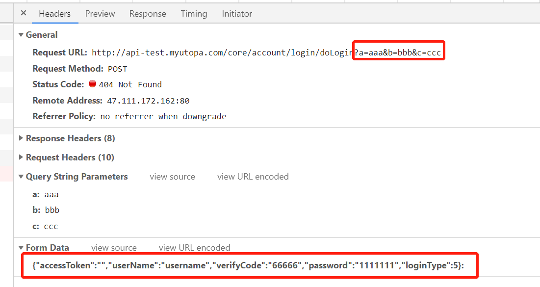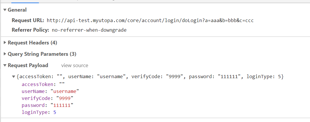 post请求当Content-Type设置为application/json;时,query(简单对象)里面的参数仍然会被拼接到请求连接后面,但是data(简单对象)里面的参数放到Request Payload中