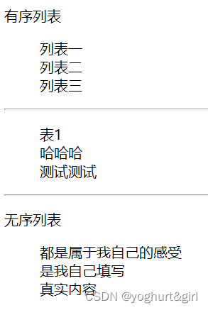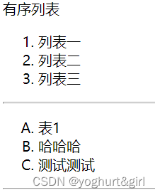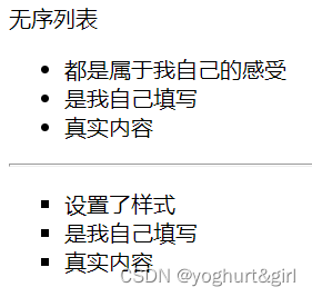 为区分开我设置了样式的列表和默认样式表,所以我用水平线分开方便观察,下面我将详细说明无序列表和有序列表关于type属性值。