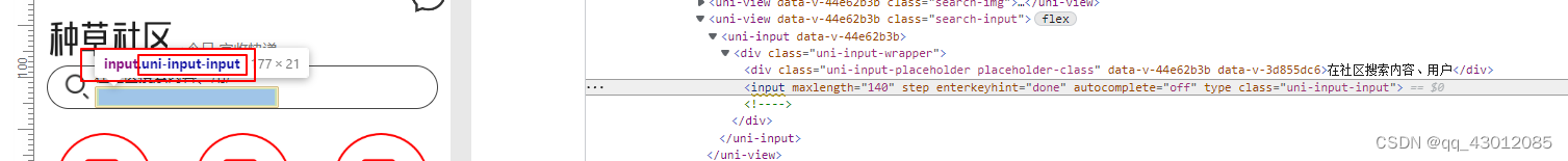 <input type="text" placeholder="在社区搜索内容、用户" placeholder-class="placeholder-class" class="" />