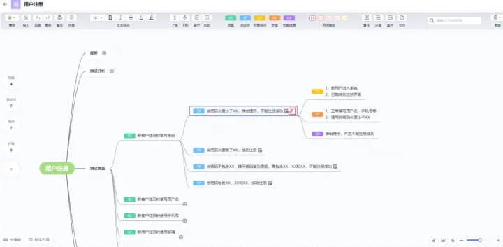 通过下图红框中的标签,设置“测试覆盖”节点中总结的多个场景,以及多个测试点(测试点的名字就是以后自动生成用例的名字),包括测试点的子节点的预置条件,步骤和预期结果。整个脑图设计的过程就结束了,下面是最重要的环节“生成/评审/归档用例”!